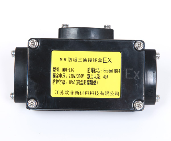 增安型中間防爆接線盒用于防爆區域與電熱帶之間的連接,以增加電熱帶的長度或用在同一管線上配不同功率的電熱帶及三叉管等較復雜的場合。它有MDE型直行接線盒與MDT型T型接線盒兩種型式,它們都按“增安型”防爆電器設計制造。防爆標志“ellT4”,與電熱帶配套后適用于工廠一區、二區爆炸性氣體混合物T4組場所。其外殼為SMC。